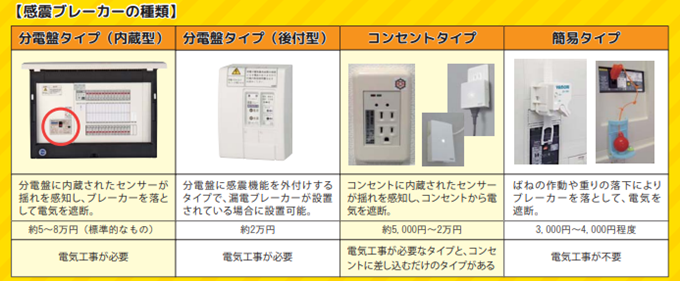 2.火災の早期発見のために、住宅用火災警報器を定期的に点検し、10年を目安に交換する。 3.火災の拡大を防ぐために、部屋を整理整頓し、寝具、衣類及びカーテンは、防炎品を使用する。 4.火災を小さいうちに消すために、消火器等を設置し、使い方を確認しておく。 5.お年寄りや身体の不自由な人は、避難経路と避難方法を常に確保し、備えておく。 6.防火防災訓練への参加、戸別訪問などにより、地域ぐるみの防火対策を行う。 ◎感震ブレーカーを設置しましょう!